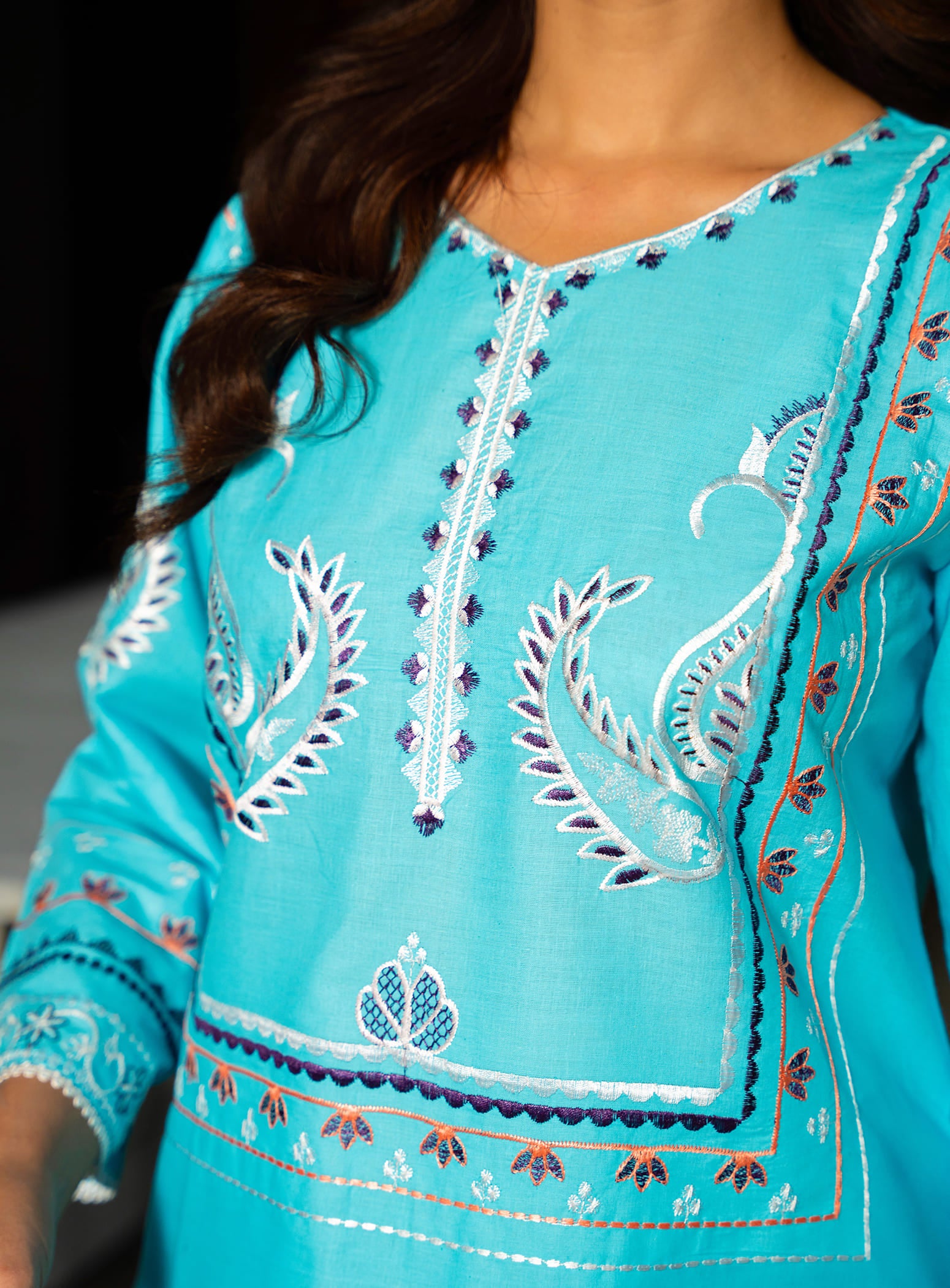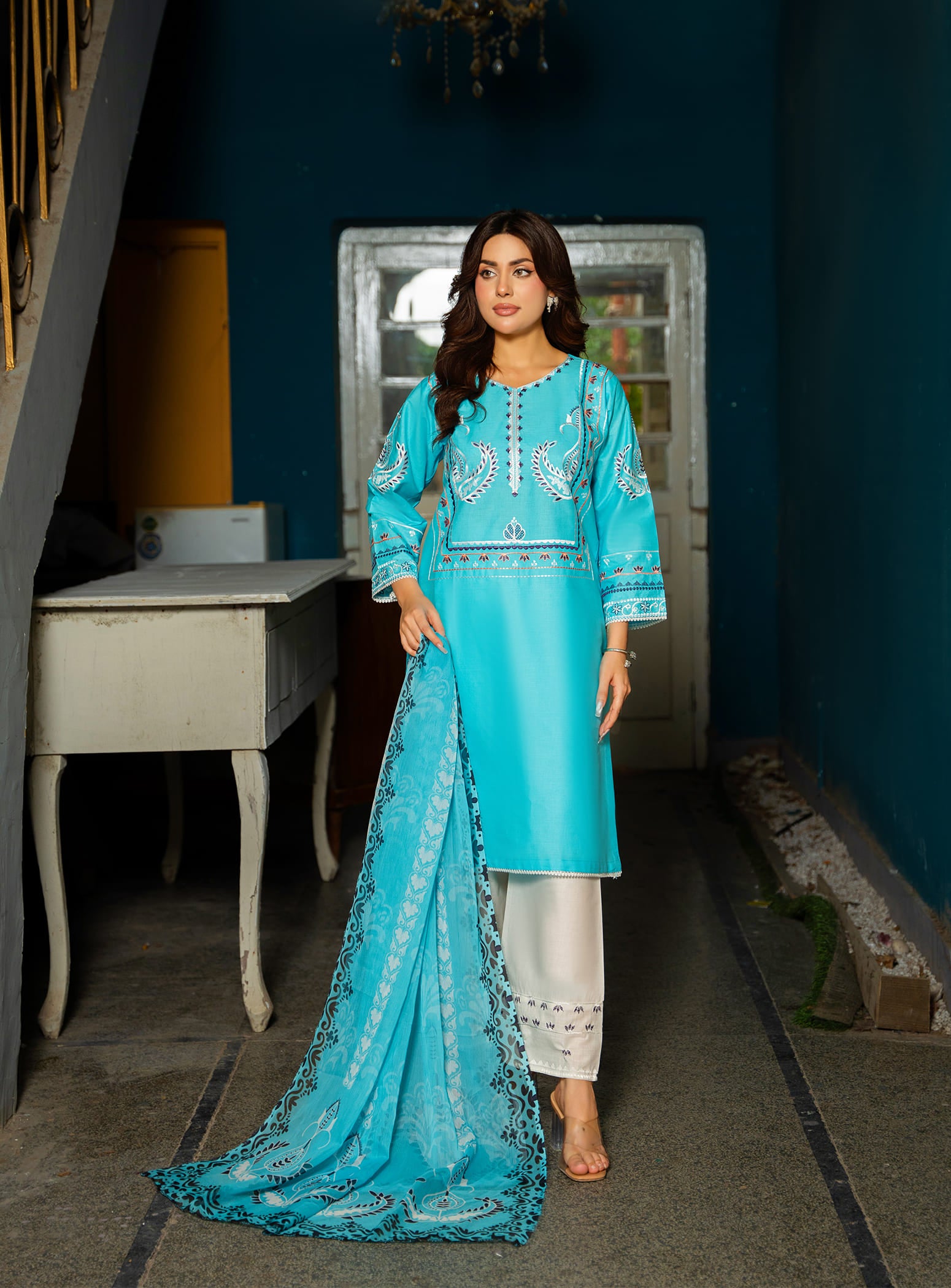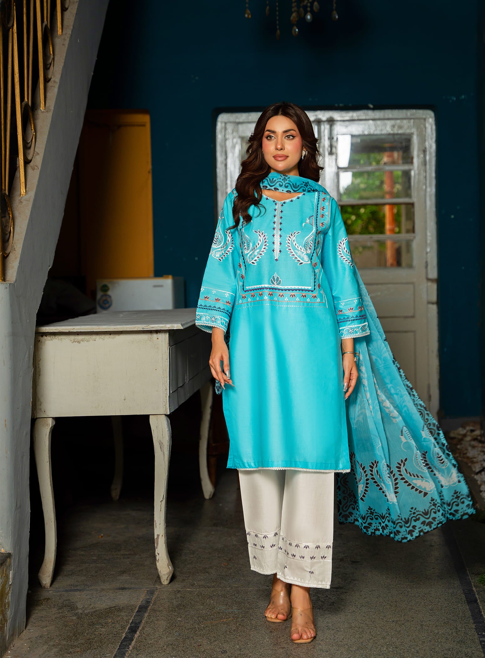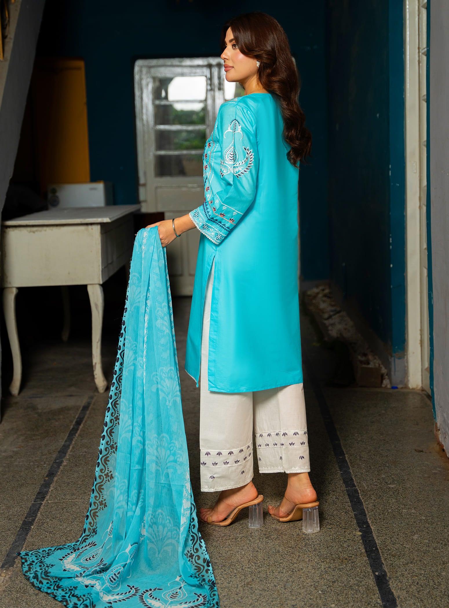 Step into serene sophistication with Aqua Whisper (Sky Mirage 3pcs) — a dreamy aquamarine ensemble that radiates freshness and charm. Crafted from lightweight breathable cotton, this stunning outfit features a delicately embroidered straight-cut kurta, matching trouser, and a vibrant digital printed dupatta for a chic summer statement. Perfect for both casual outings and festive gatherings, this look combines effortless comfort with timeless elegance.