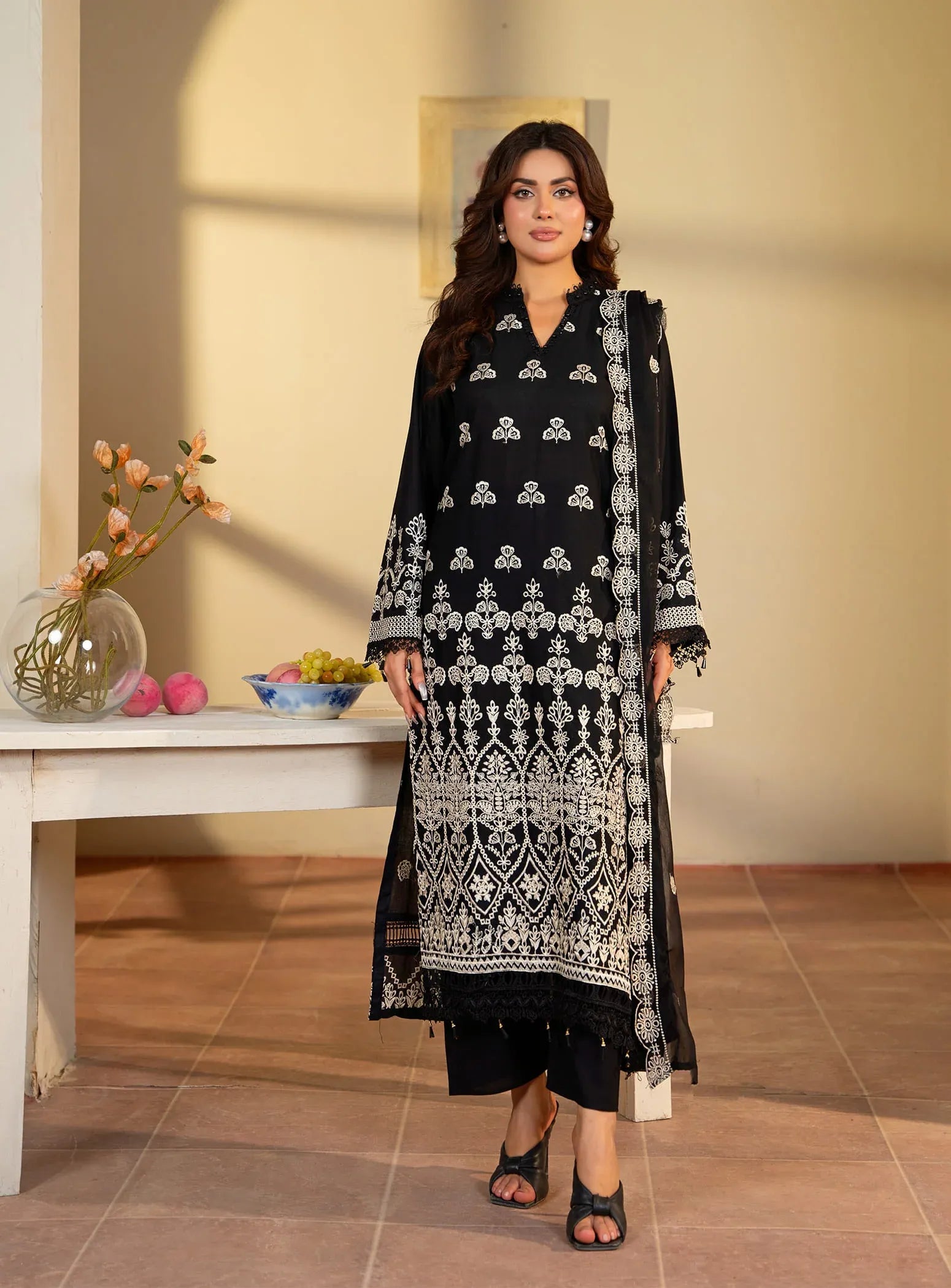 Unveil timeless sophistication with Black Emb, a classic 3-piece embroidered cotton suit that reflects elegance in every detail. Designed in rich black with intricate white embroidery, this ensemble features a straight-cut embroidered shirt, matching trousers, and a beautifully embroidered dupatta, creating a graceful and complete look. Perfect for all seasons, it blends comfort, style, and tradition effortlessly.
