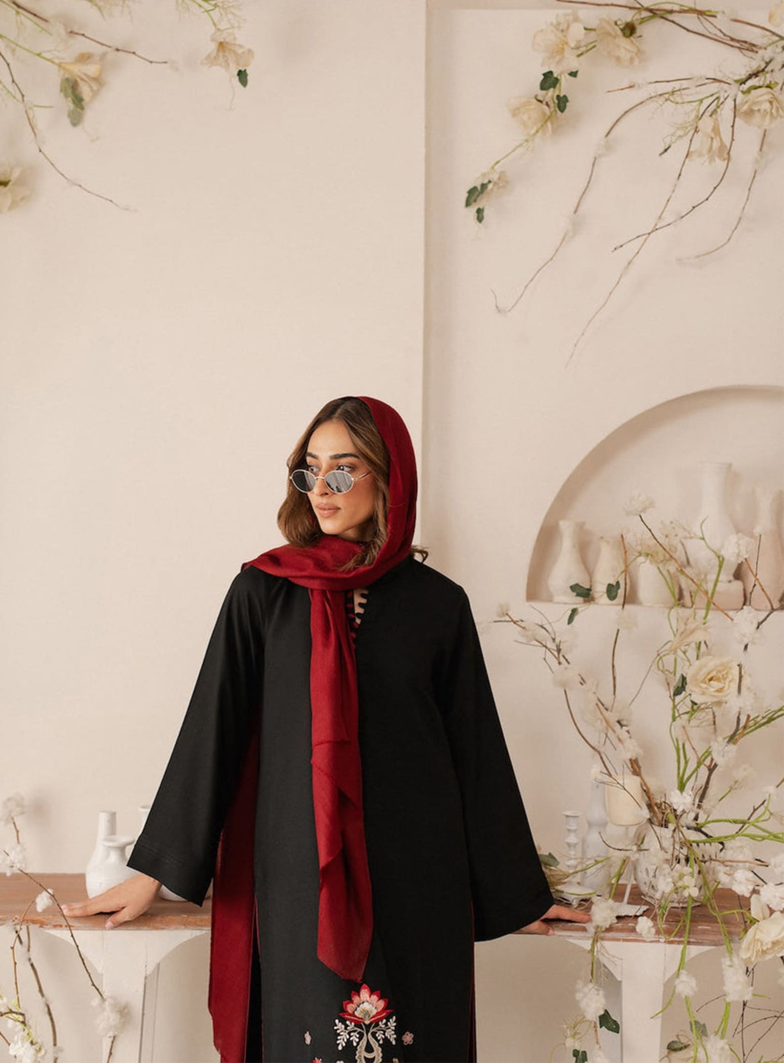 🎨 Color Contrast: Elegant tones with a rich maroon shawl