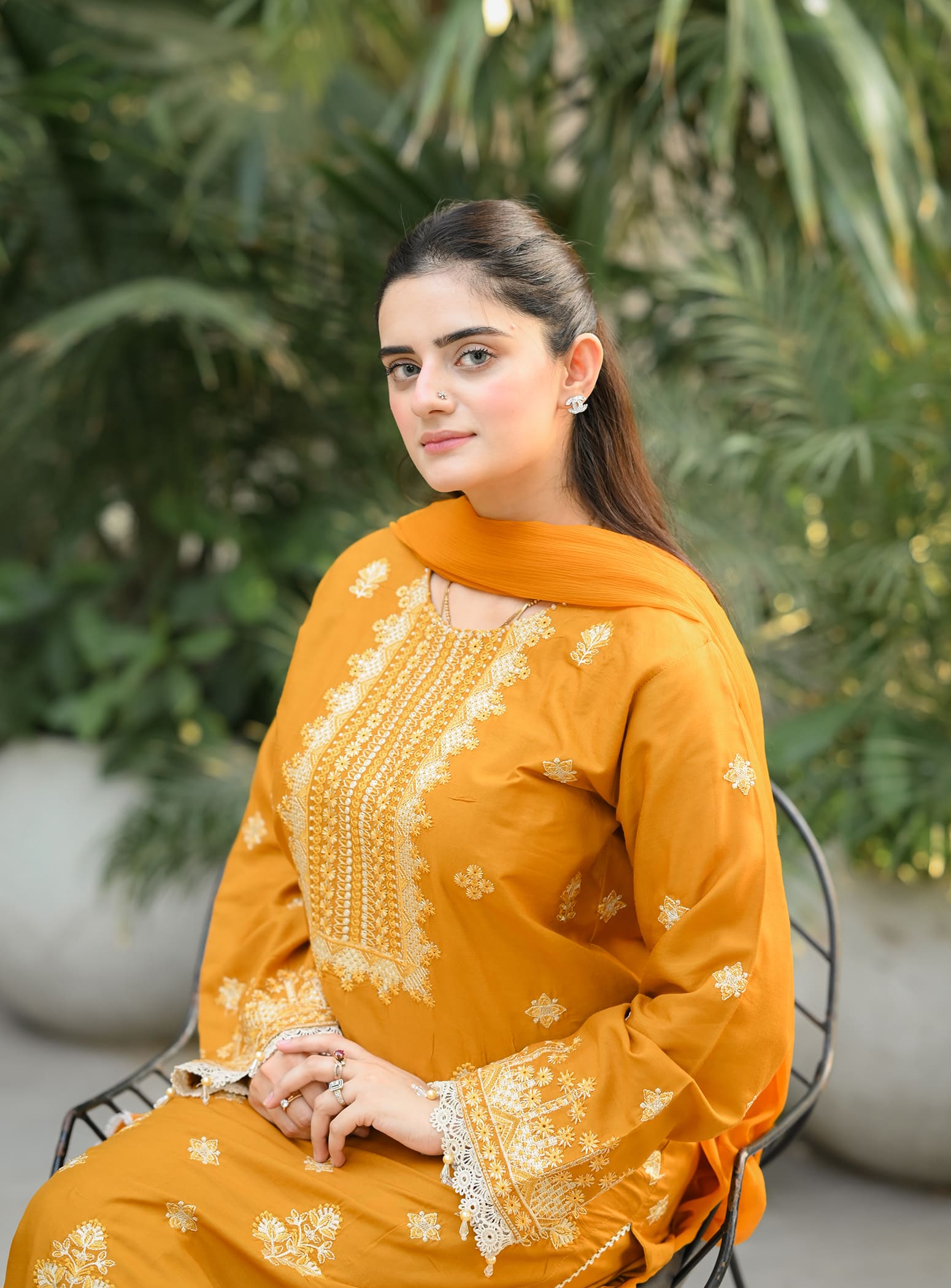 Bring a touch of radiance to your wardrobe with our Golden Grace 3PC Mustard Embroidered Dress. Crafted from premium Dhank fabric, this elegant ensemble features a beautifully embroidered long-length shirt, standard-fit trousers, and a soft shawl for a graceful look. Perfect for festive occasions or daytime elegance, this outfit combines comfort, charm, and timeless eastern sophistication — exclusively from Samra’s Collection. ✨