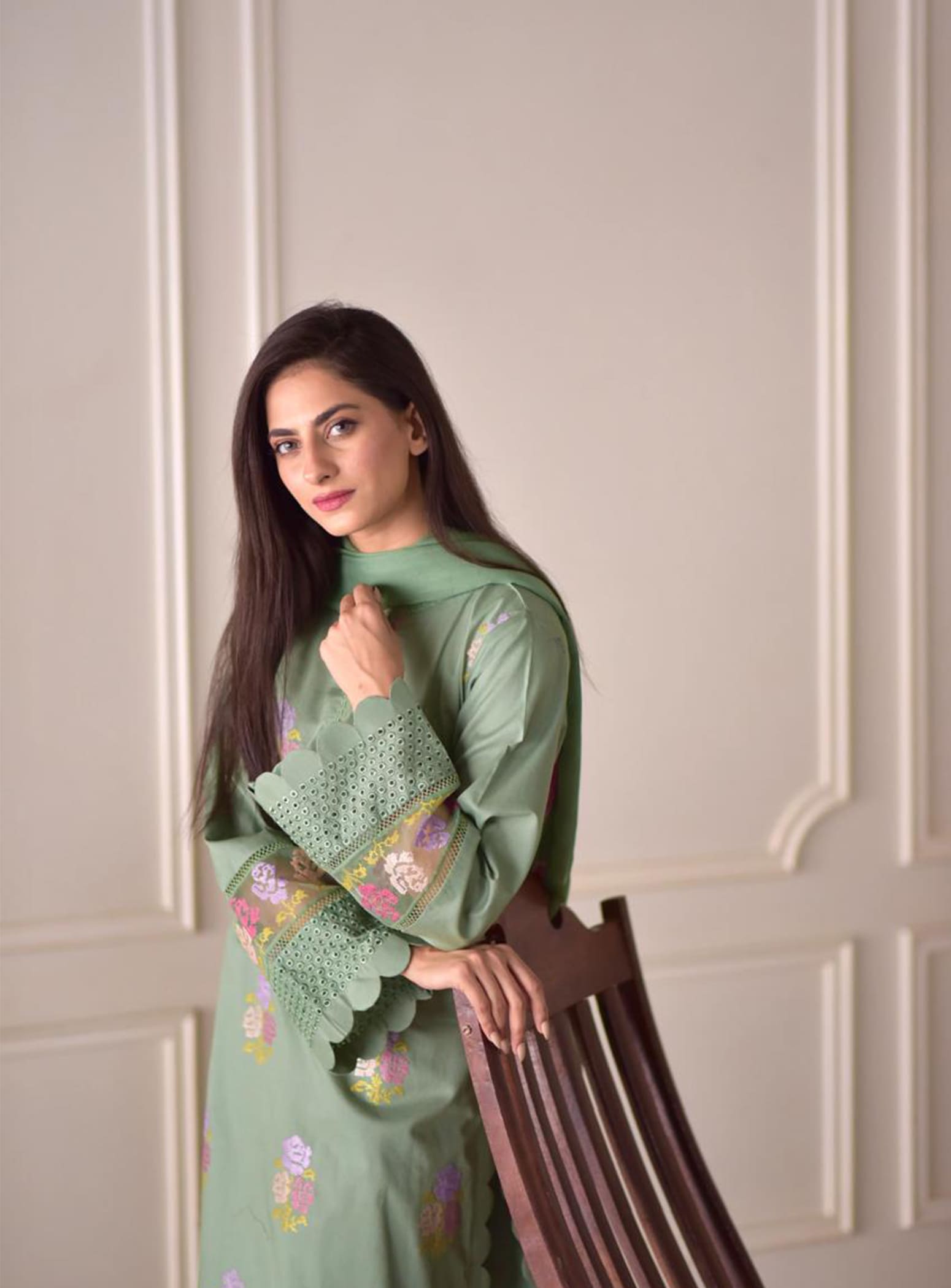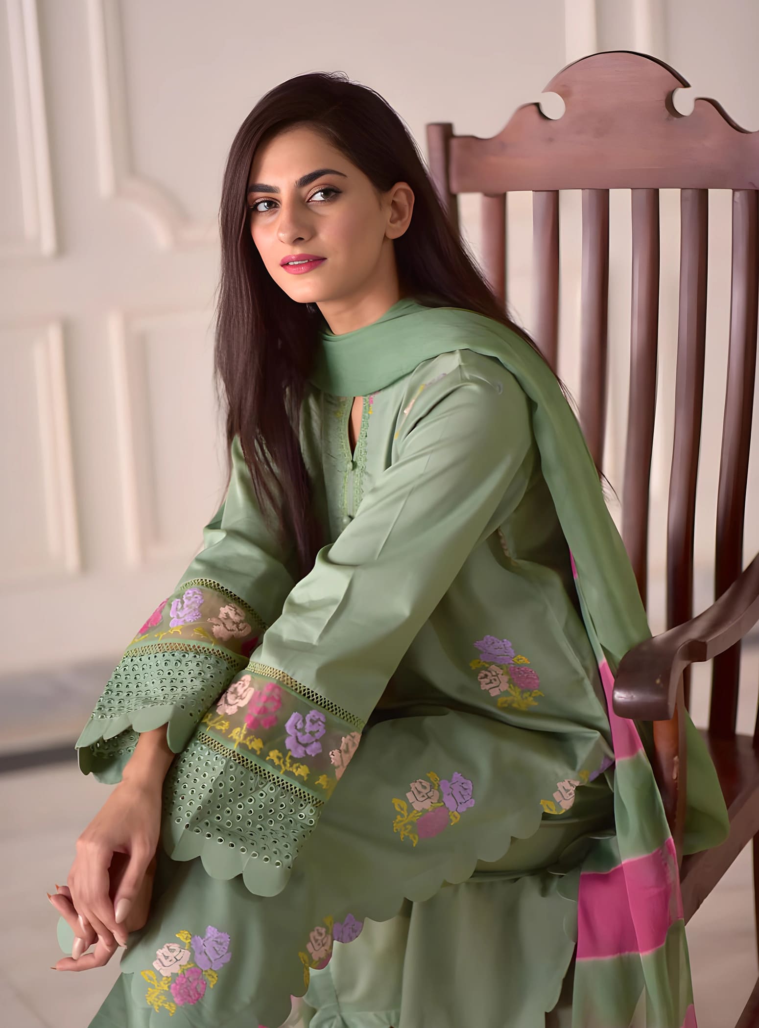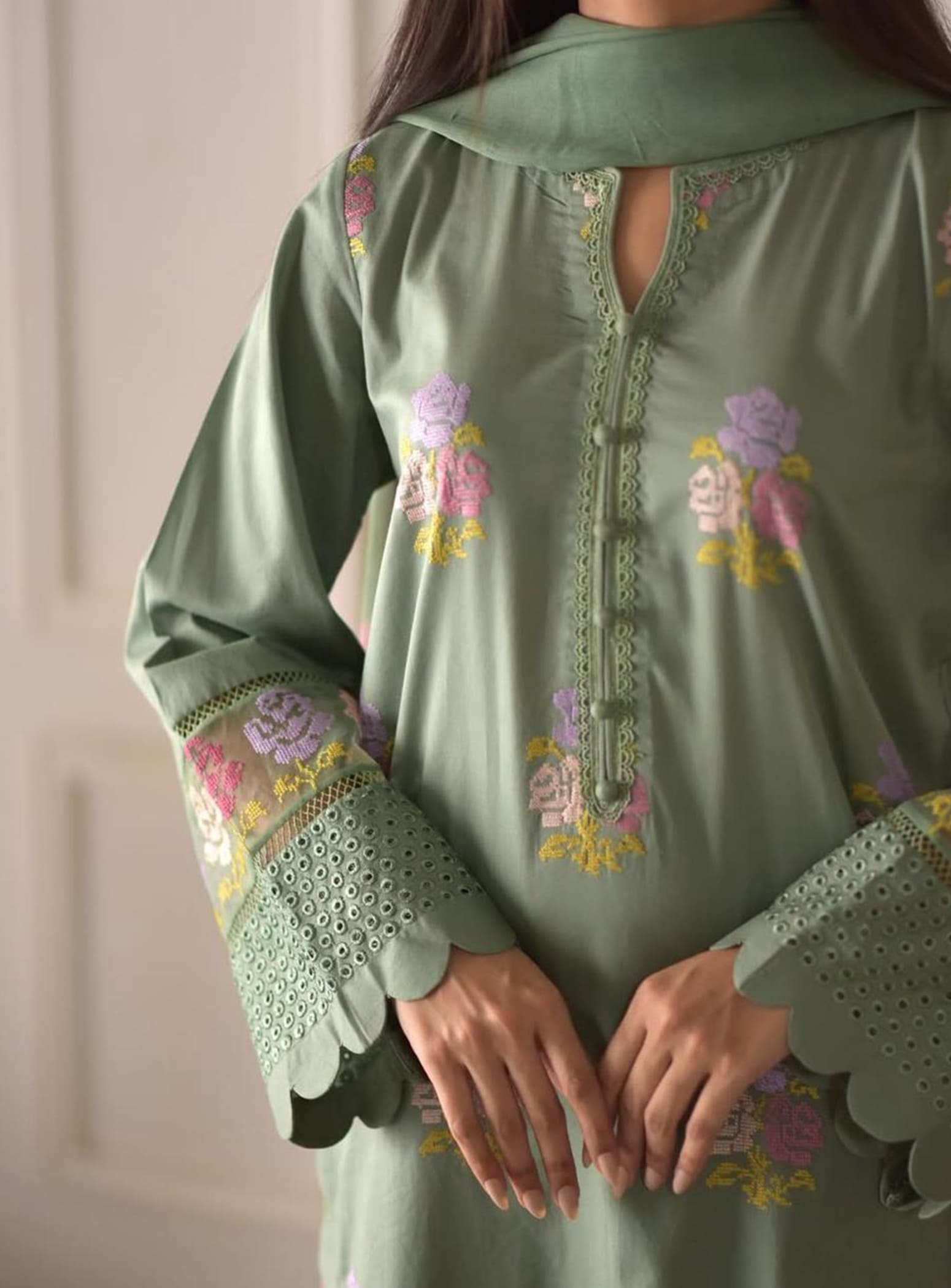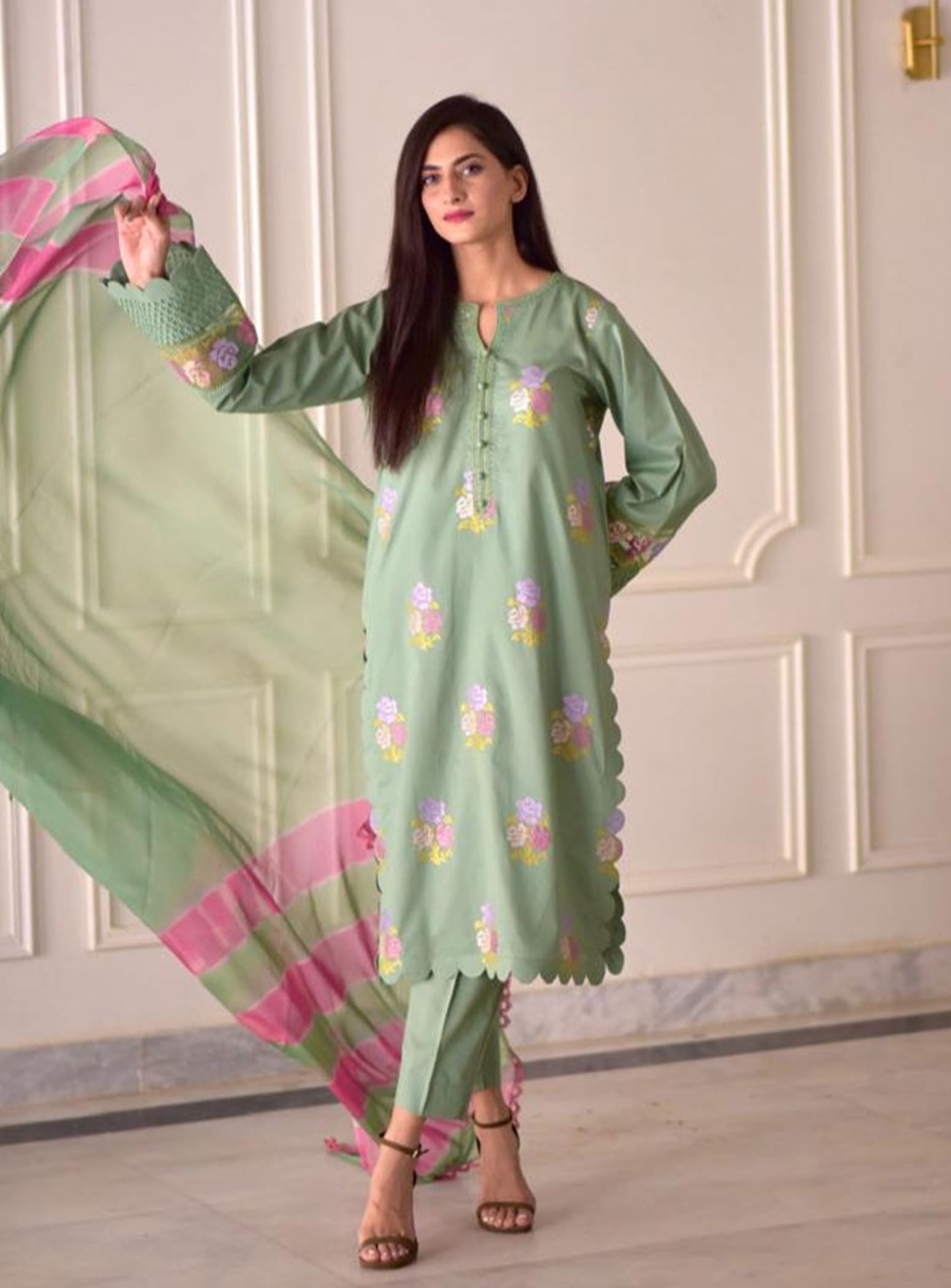 Radiate serene charm this season with Mint Whisper, a beautifully embroidered 3-piece cotton ensemble in a soft pastel green hue. The long kurta pairs seamlessly with straight trousers and a flowy poly silk dupatta — blending grace, comfort, and summer freshness in every thread.