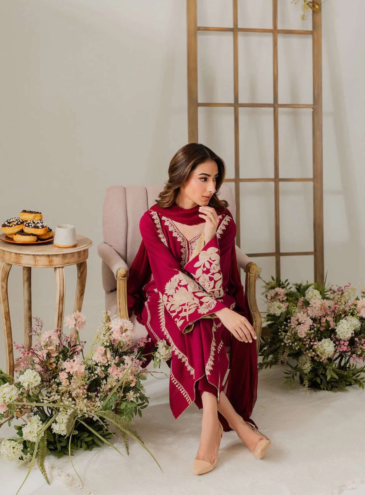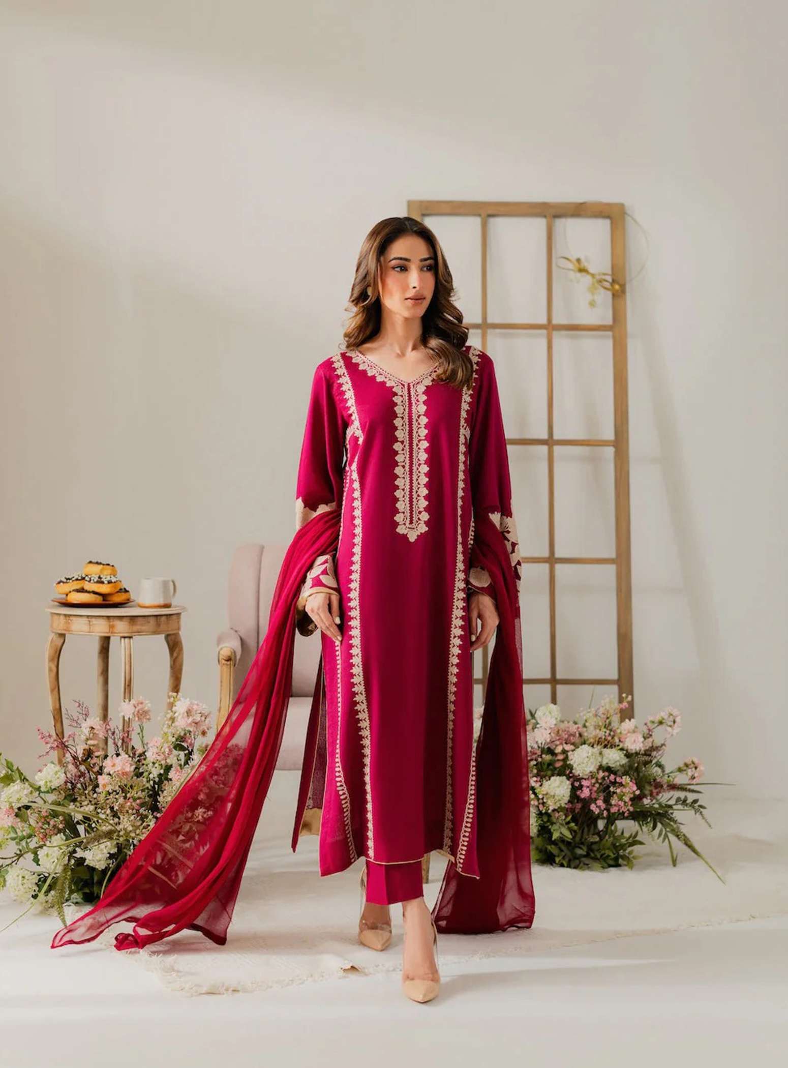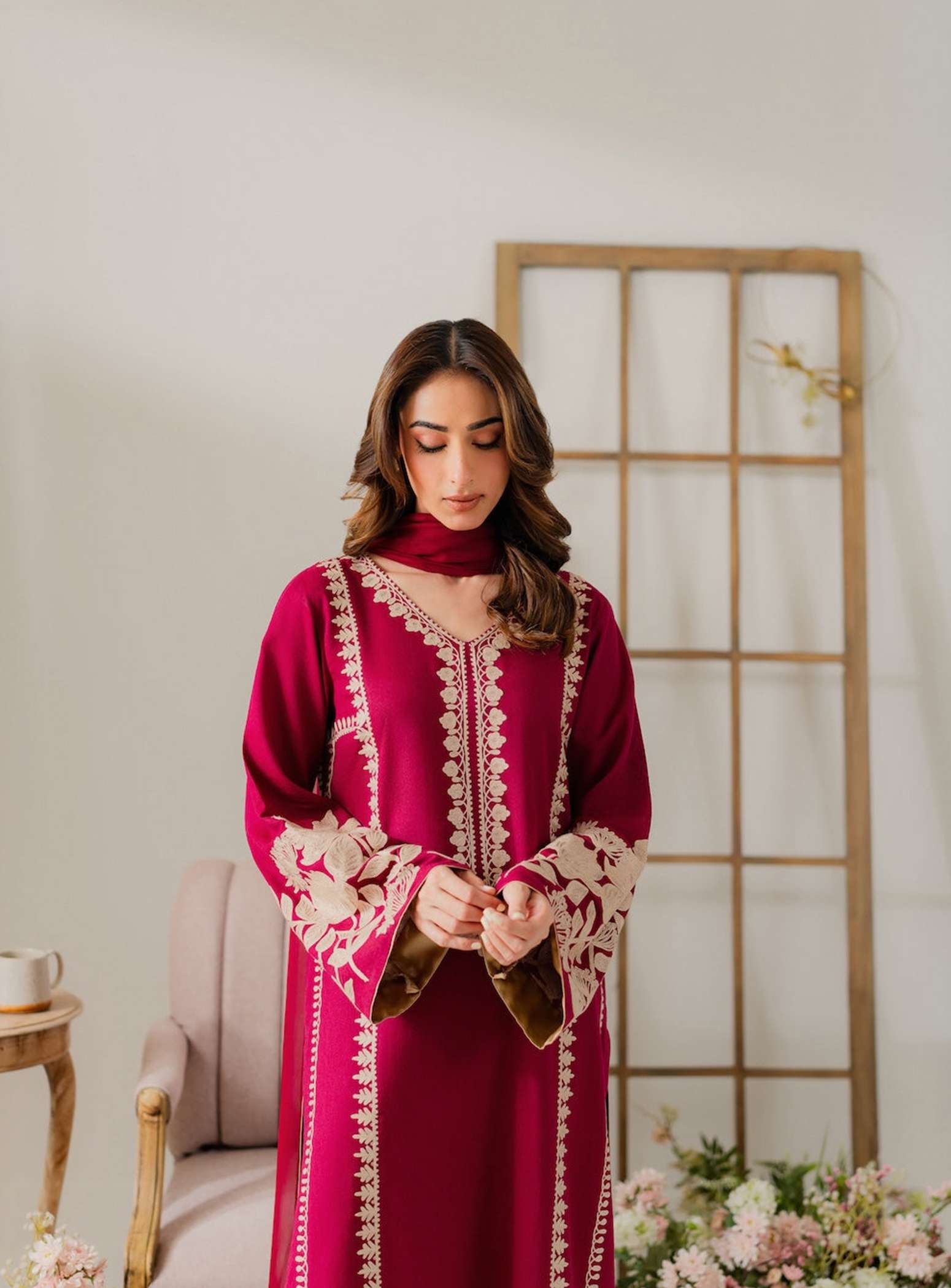 Unveil timeless charm with the Mira Mahroon 3-Piece Stitched Suit, a perfect fusion of comfort and sophistication. ✨ Crafted from premium linen, this elegant maroon-red outfit features delicate embroidery, a graceful long shirt, and standard-fit trousers — completed with an elegant matching shawl for a refined, complete look.