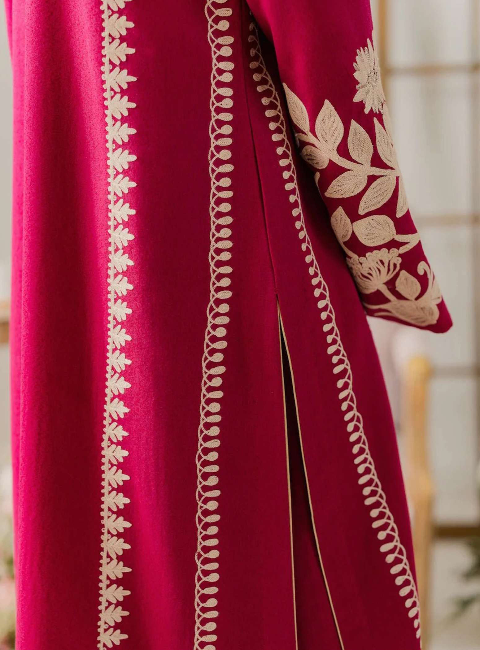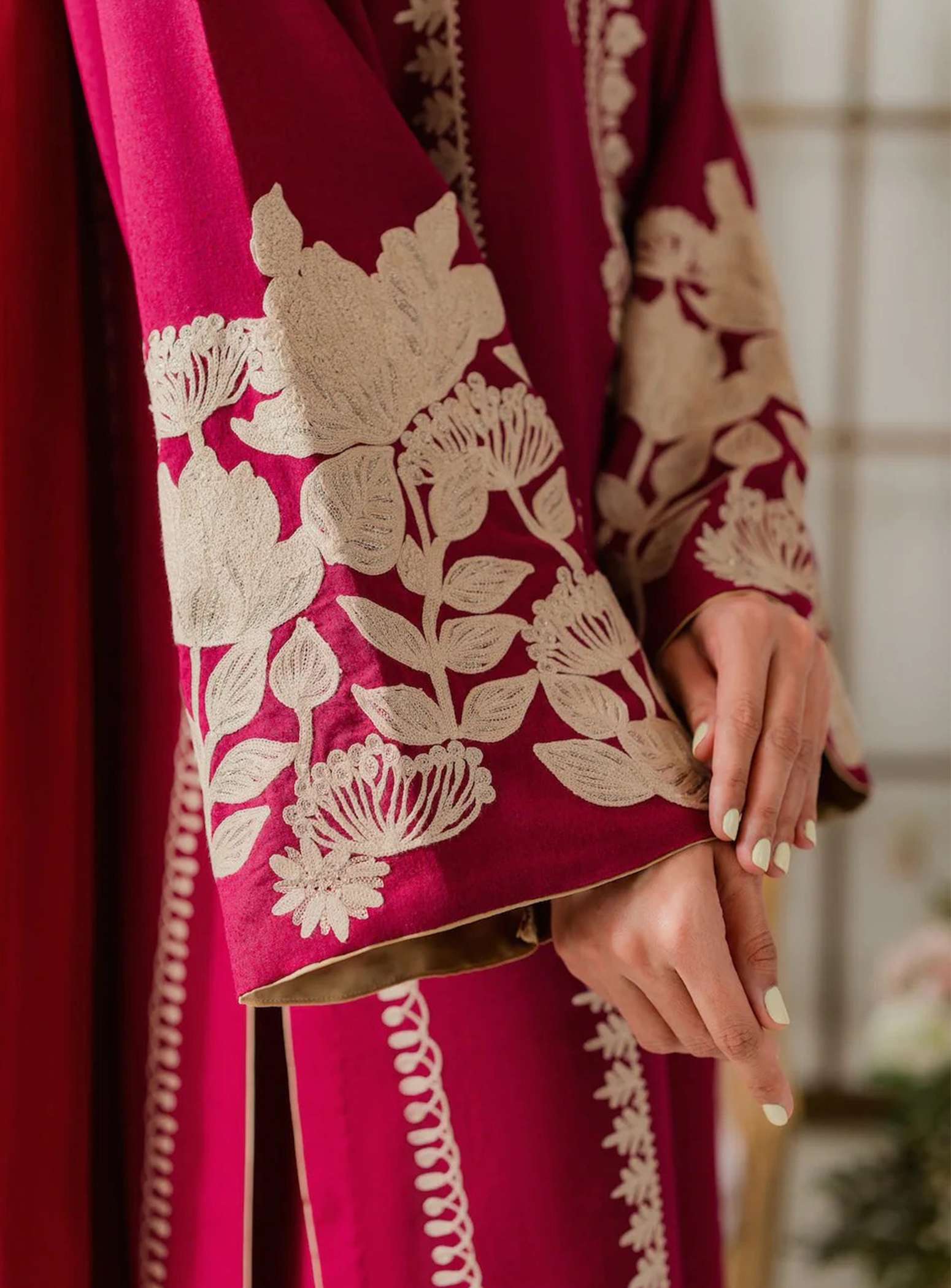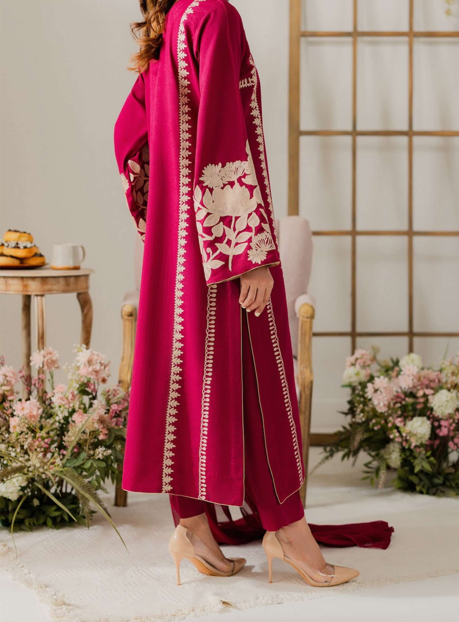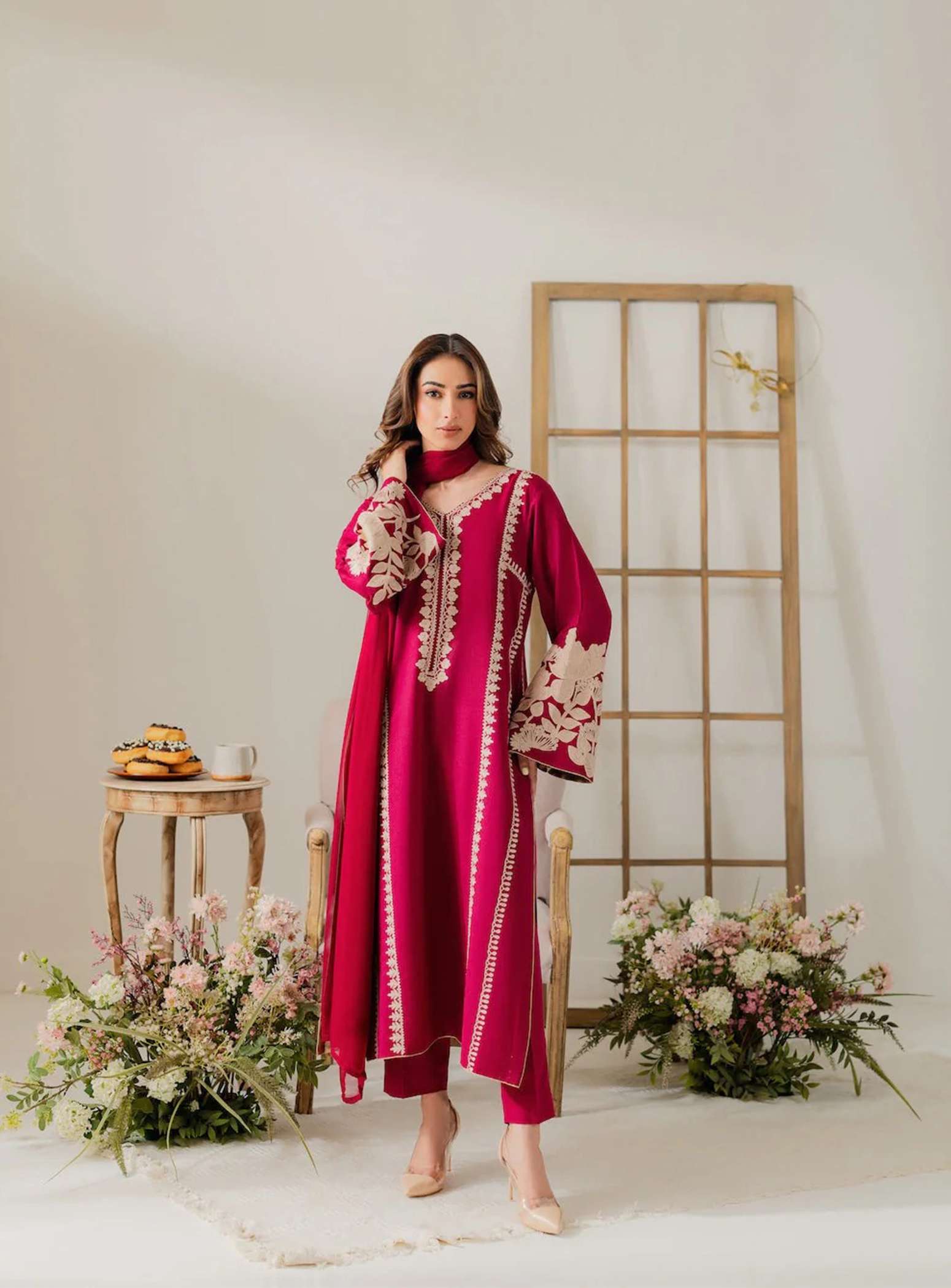 Unveil timeless charm with the Mira Mahroon 3-Piece Stitched Suit, a perfect fusion of comfort and sophistication. ✨ Crafted from premium linen, this elegant maroon-red outfit features delicate embroidery, a graceful long shirt, and standard-fit trousers — completed with an elegant matching shawl for a refined, complete look.