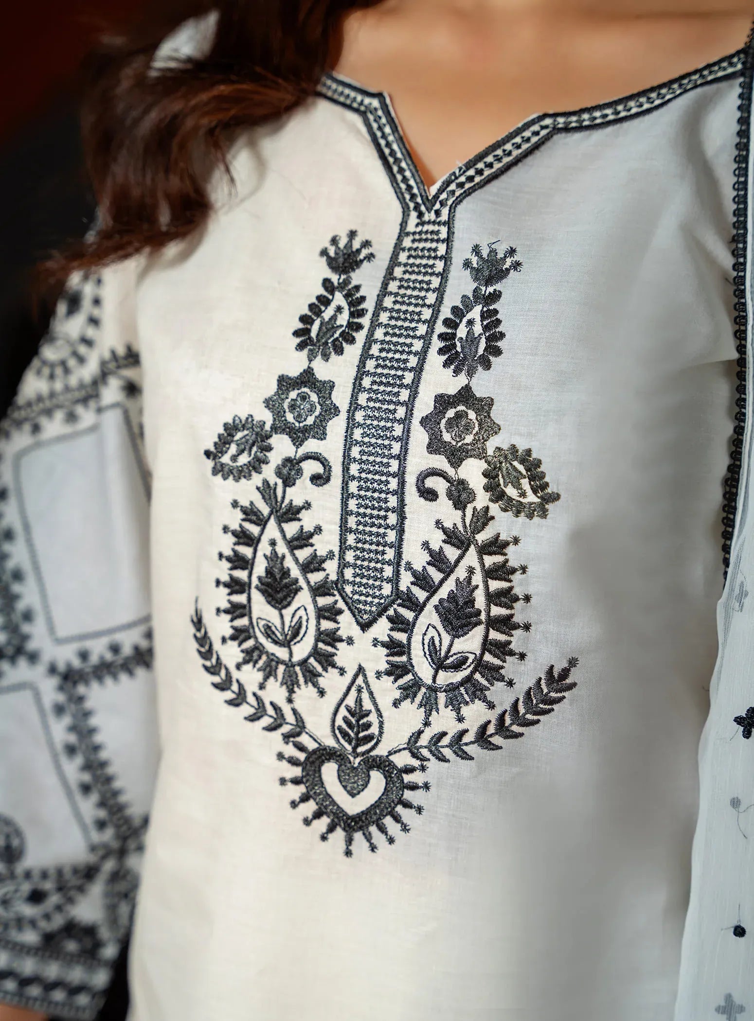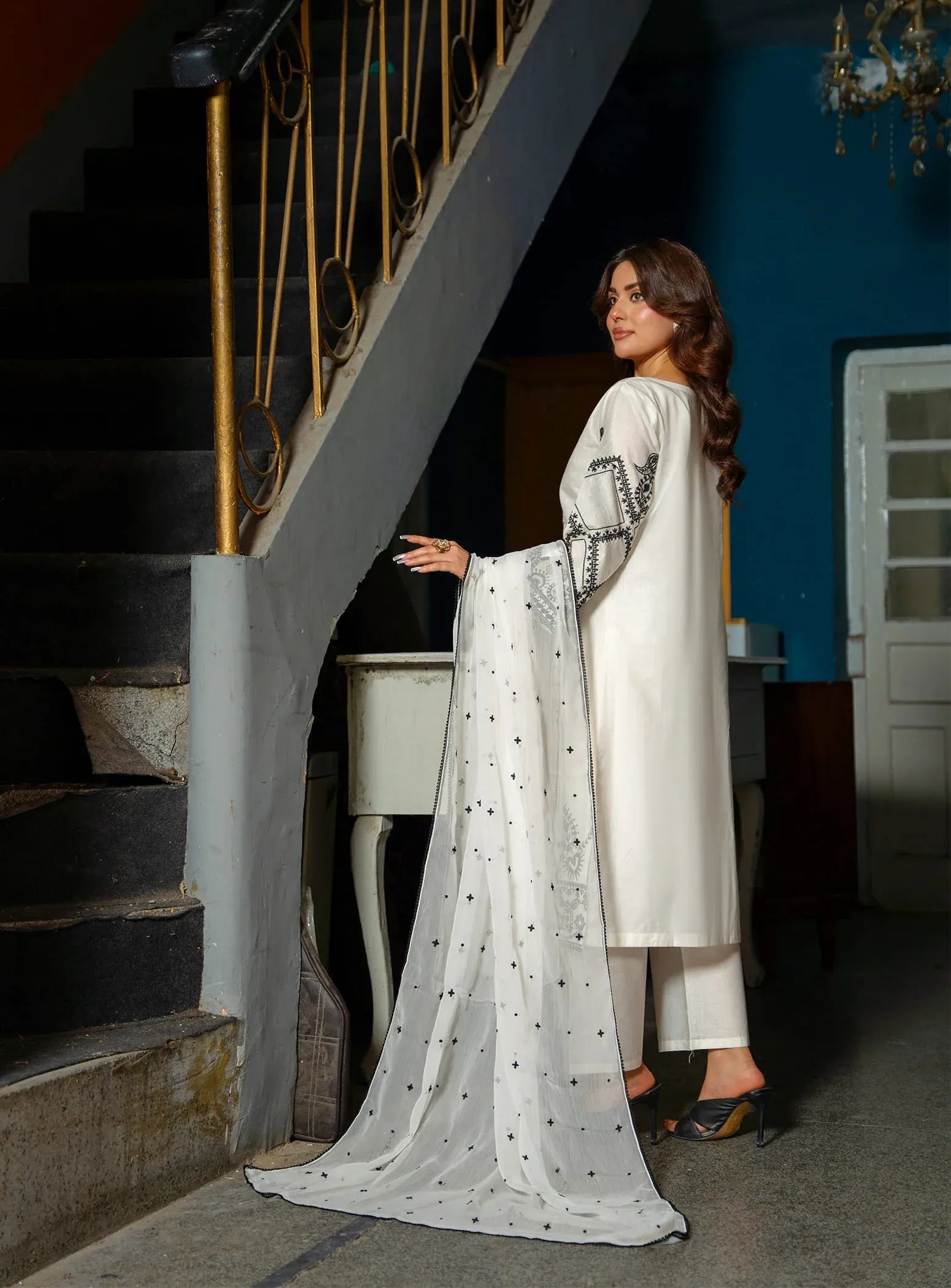 tep into refined elegance with Pearl Radiance (Ayra White 3pcs) — a graceful ensemble crafted from premium cotton for a soft, breathable feel. The outfit features a beautifully embroidered long kurta, sleek straight trousers, and a light chiffon dupatta, creating a timeless look that’s perfect for summer days or graceful evening wear. With its pure white tone and delicate craftsmanship, this outfit reflects effortless sophistication and charm.