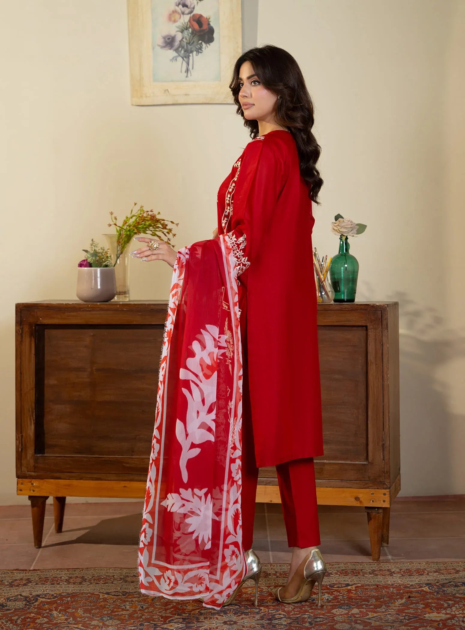 Embrace timeless elegance with the Red Royal 3-Piece Suit, crafted from premium cotton for all-day comfort and sophistication. This radiant red ensemble features a beautifully embroidered long kurta, straight-fit trouser, and a soft chiffon dupatta — a perfect blend of charm, grace, and style for your summer wardrobe.