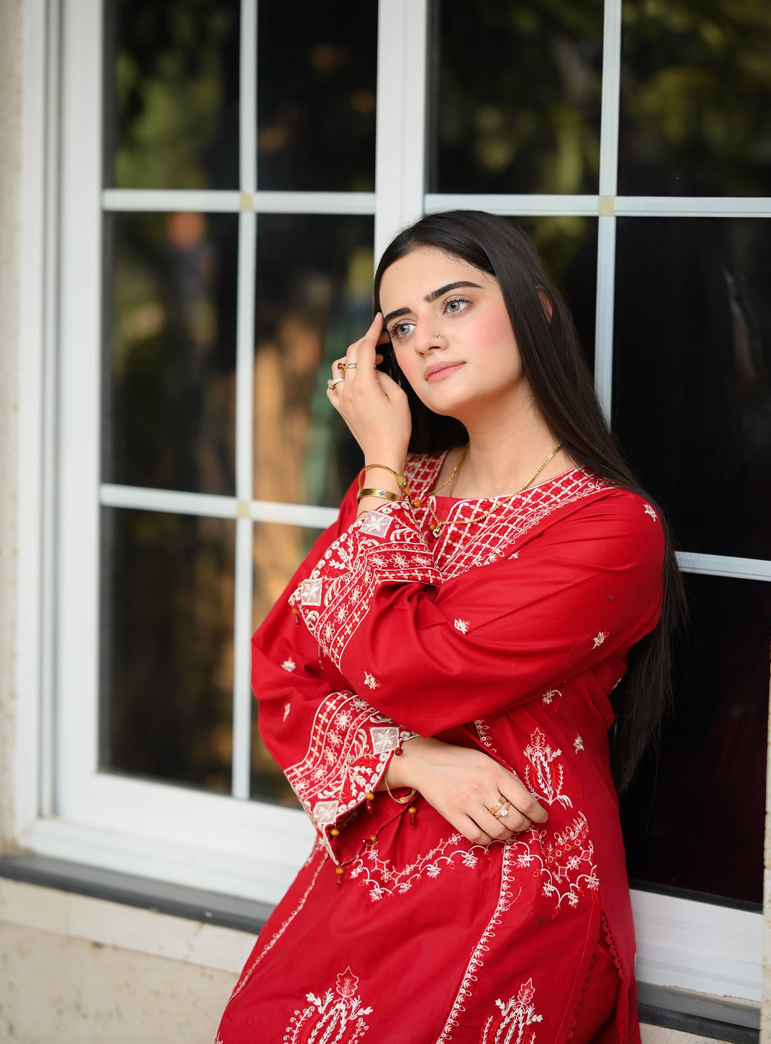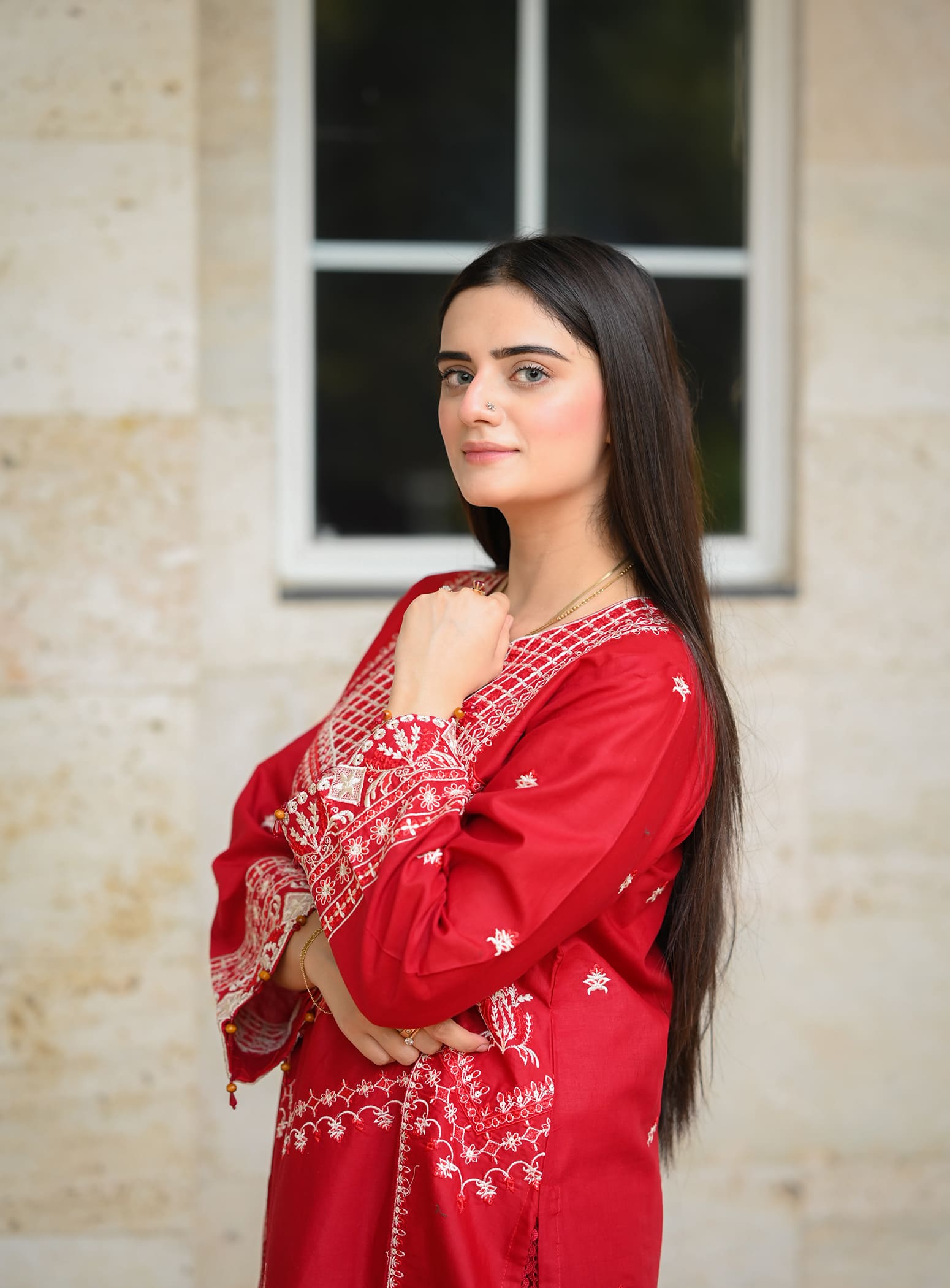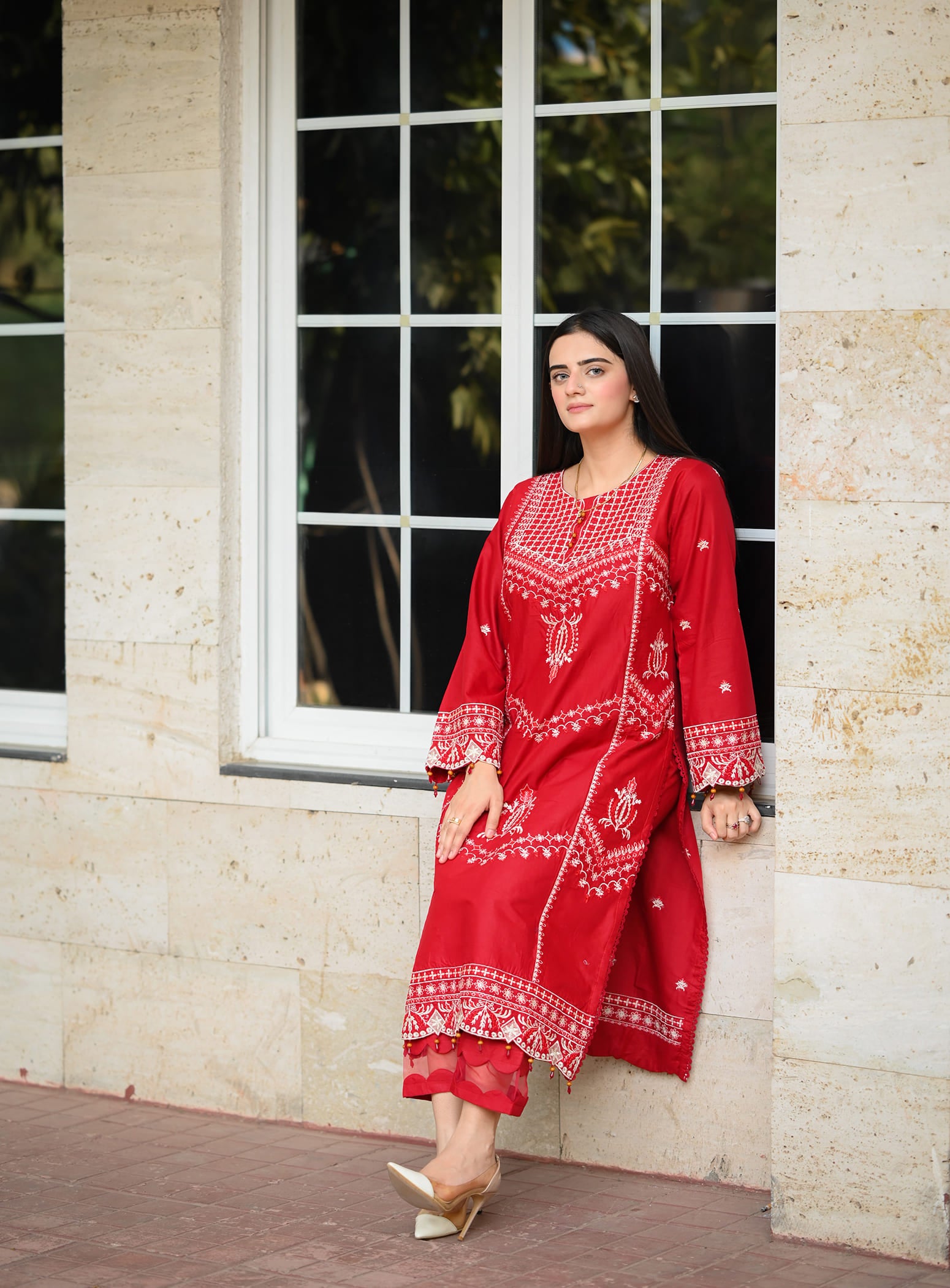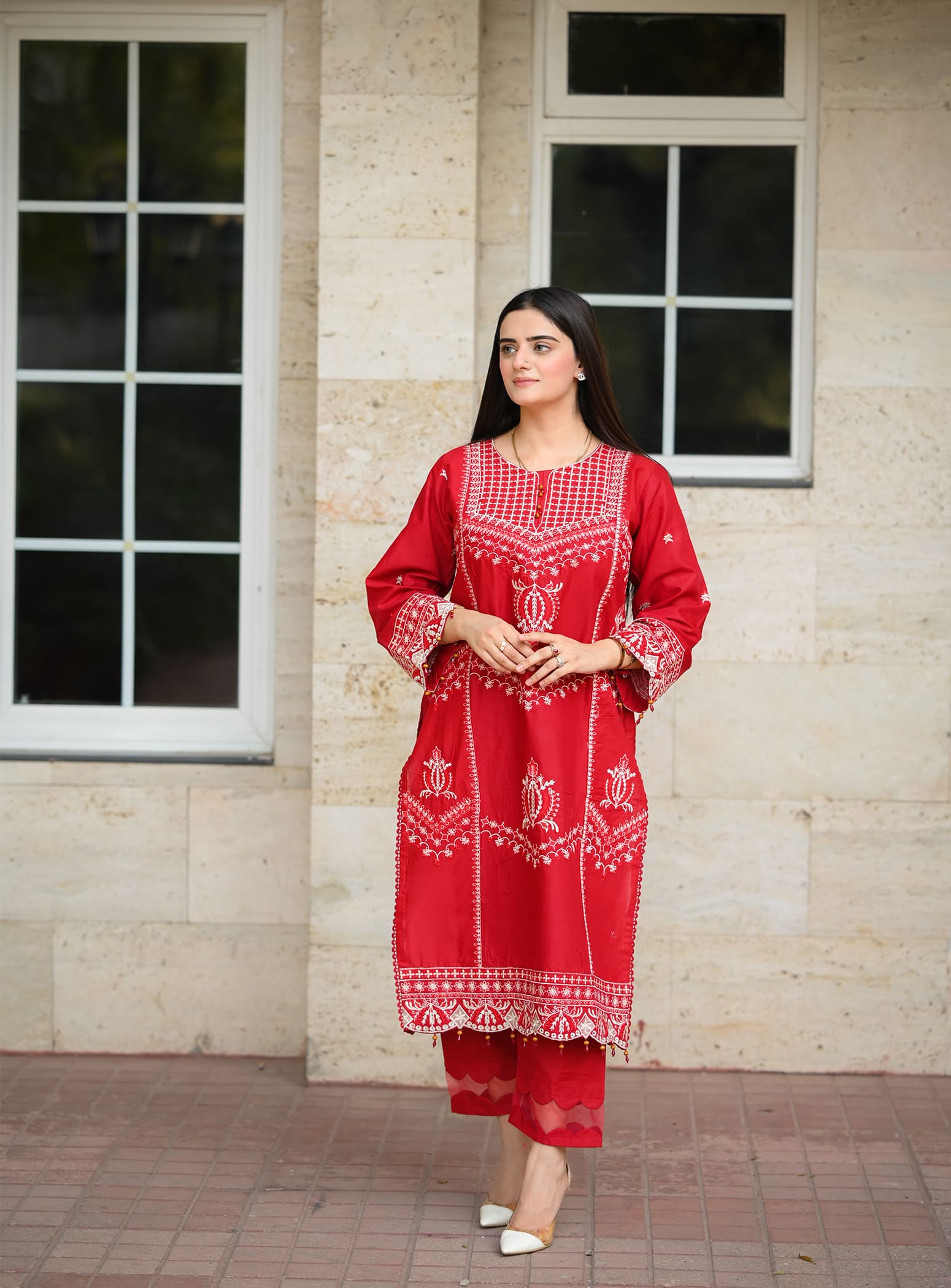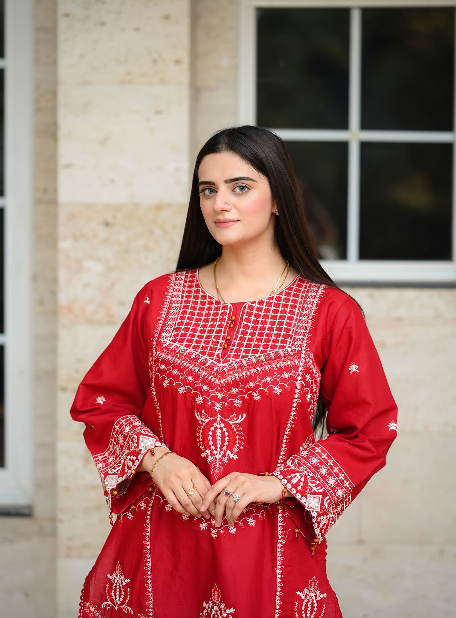 Add a touch of timeless grace to your wardrobe with Ruby Essence (Haya Emb 2pc) — a stunning maroon embroidered cotton outfit that beautifully blends tradition and sophistication. Crafted from premium soft cotton, this elegant 2-piece features delicate embroidery on the front, sleeves, and borders, paired with a matching straight trouser for a refined finish. Perfect for casual gatherings, festive occasions, or graceful everyday wear.