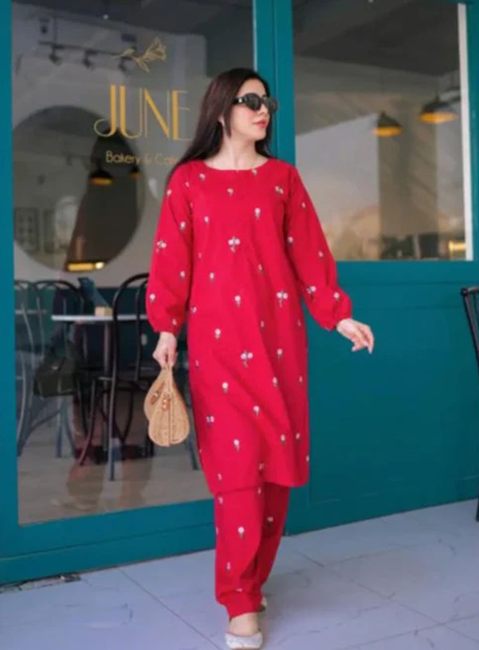 Grace meets simplicity in Scarlet Petal, a stunning 2-piece embroidered outfit crafted from premium linen. This elegant red ensemble features a beautifully detailed petal embroidery pattern on a straight-cut kurta, paired with a matching straight trouser for a polished, graceful look. Perfect for all seasons and any occasion. ✨