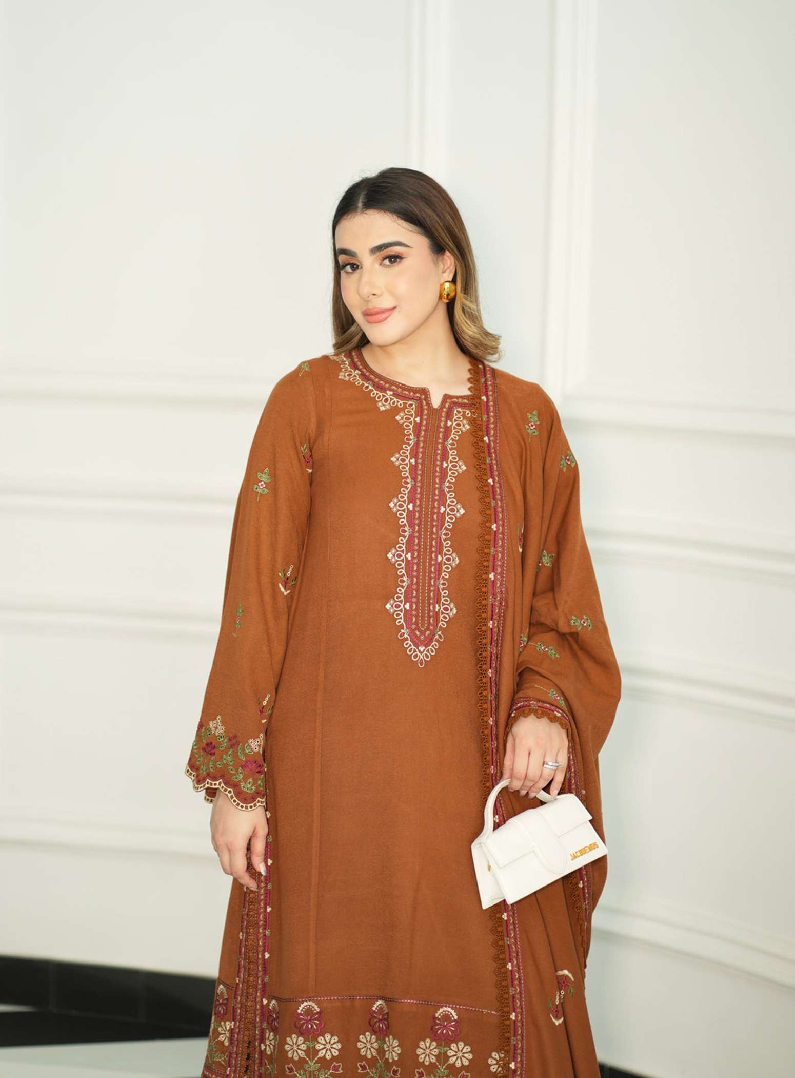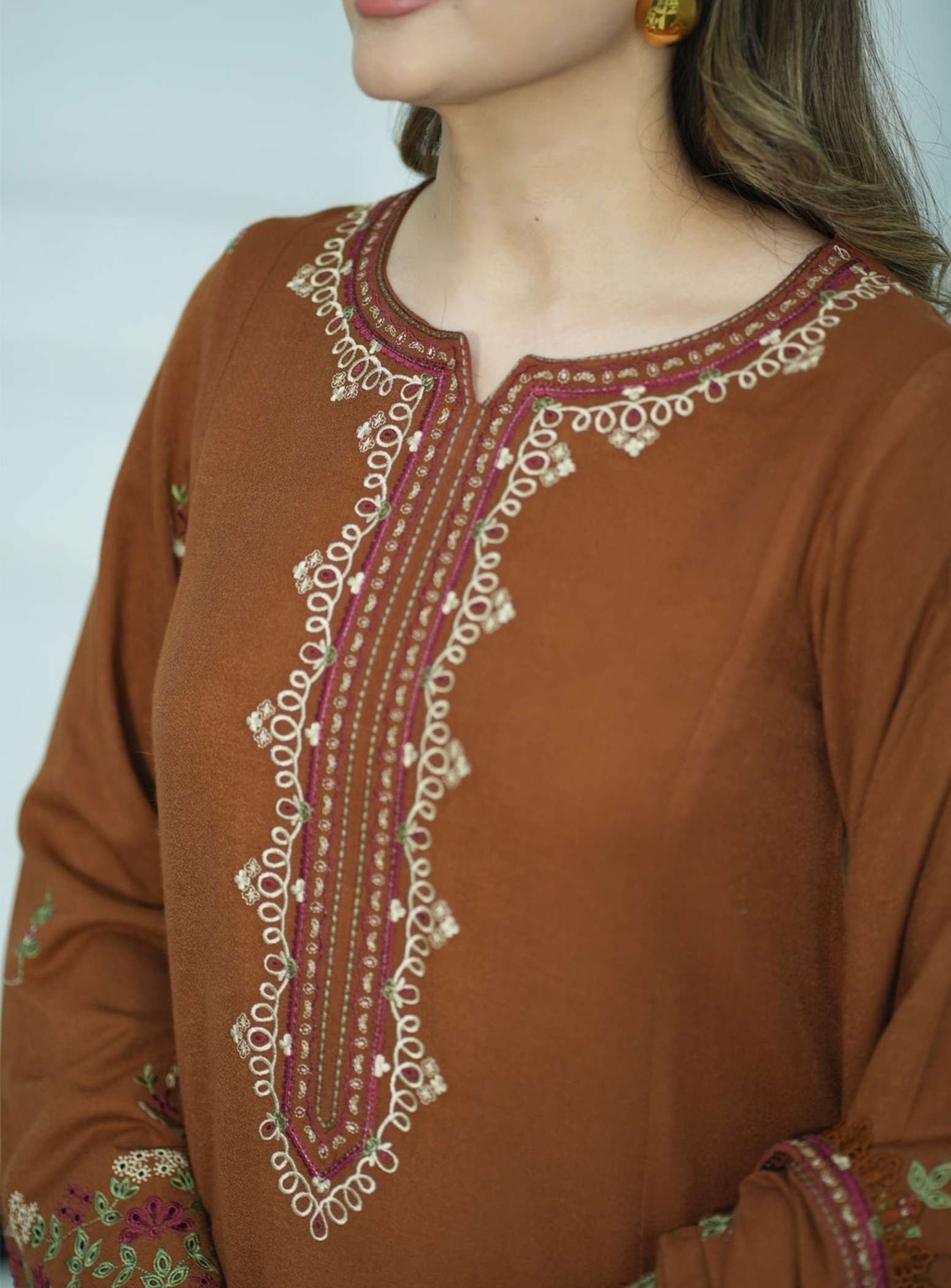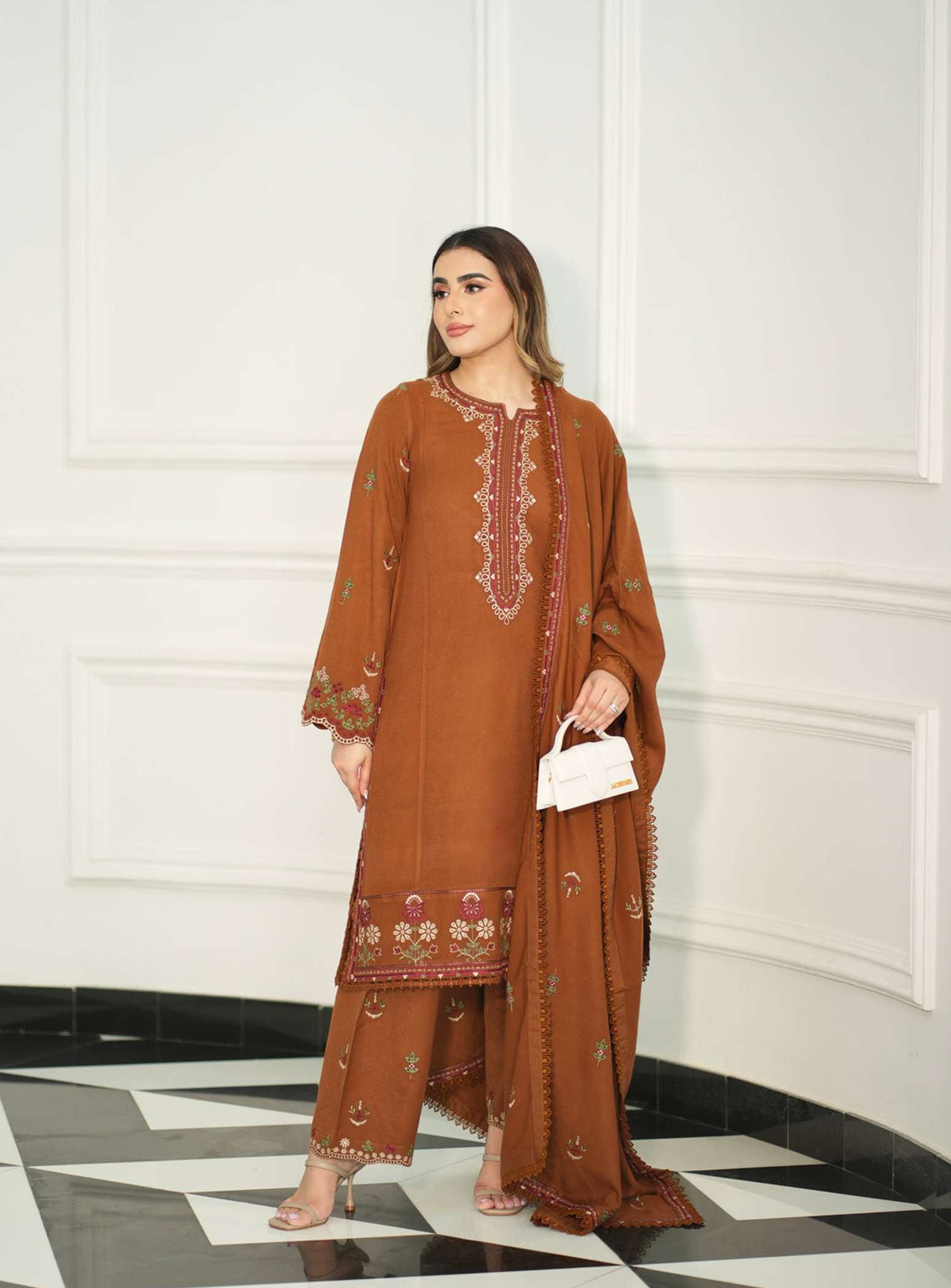 Embrace the charm of earthy elegance with the Winter Glow 3Pcs Suit, designed for warmth and sophistication this winter. Crafted from premium Dhanak fabric, this beautifully embroidered long kurta is paired with matching trousers and a soft Dhanak shawl — creating the perfect balance of comfort, tradition, and modern grace.